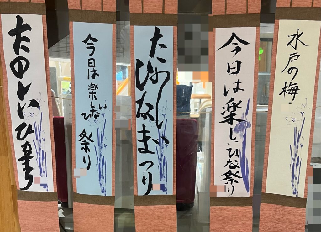 先日、書道にてひな祭りに関する作品を書きました。内容は利用者様ご自身に考えていただき、それぞれ思い思いのものとなりました。
